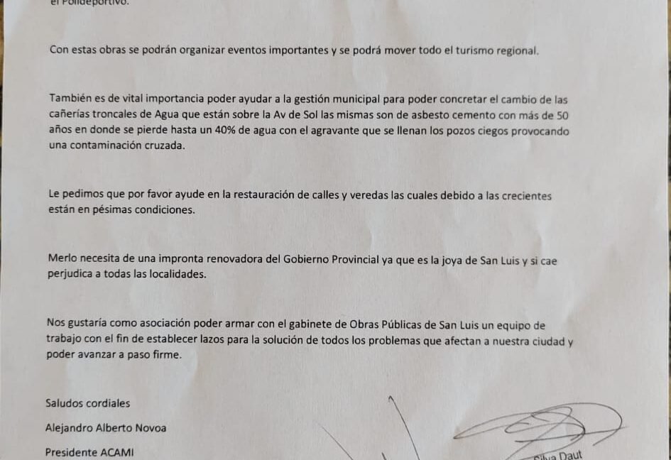 En el Día de Hoy 9/02/24 se presentó Nota Dirijida al Gobernador con temas relacionado a Infraestructura . Adjuntamos ACAMI