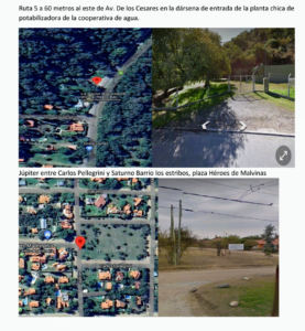 - Ruta 5 a 60 metros al Este de la Av de los Césares en la dársena de entrada de la planta chica de potabilizadora de la cooperativa de Merlo .